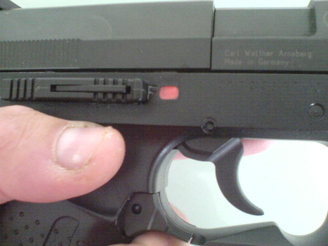 The pistol has a very good positive slide safety catch with an inbuilt button that prevents the safety from sliding accidentally to the off position when holstering. You must press this button down before the safety can be disengaged.